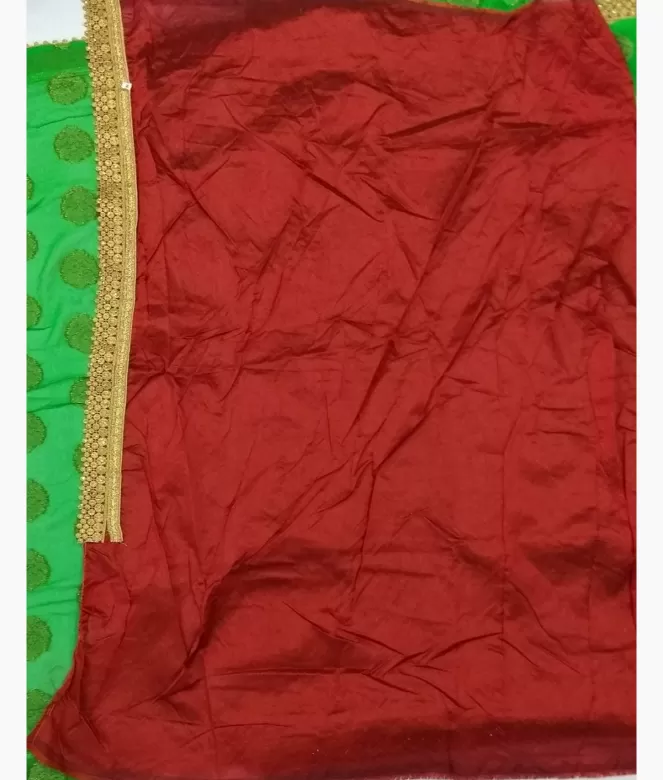 Border is of golden colour gota cut work design on saree with sequence work. Contrast colour blouse is of khadi silk fabric with matching work of saree border patti for neck and sleeves.