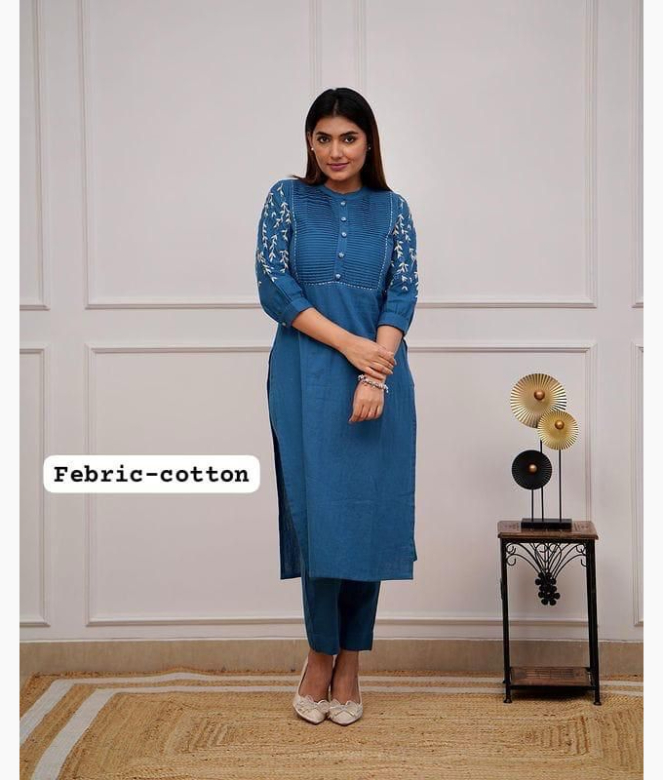 Elevate your everyday ethnic style with this beautifully stitched cotton embroidery Kurta paired with a classic blue cotton pant. Made from soft, breathable cotton, the Kurta features delicate and intricate embroidery that adds a subtle charm to its elegant design. The comfortable fit and lightweight fabric make it perfect for warm days, while the fine detailing gives it a touch of traditional grace. The soothing tones and thoughtful craftsmanship make this Kurta ideal for office wear.