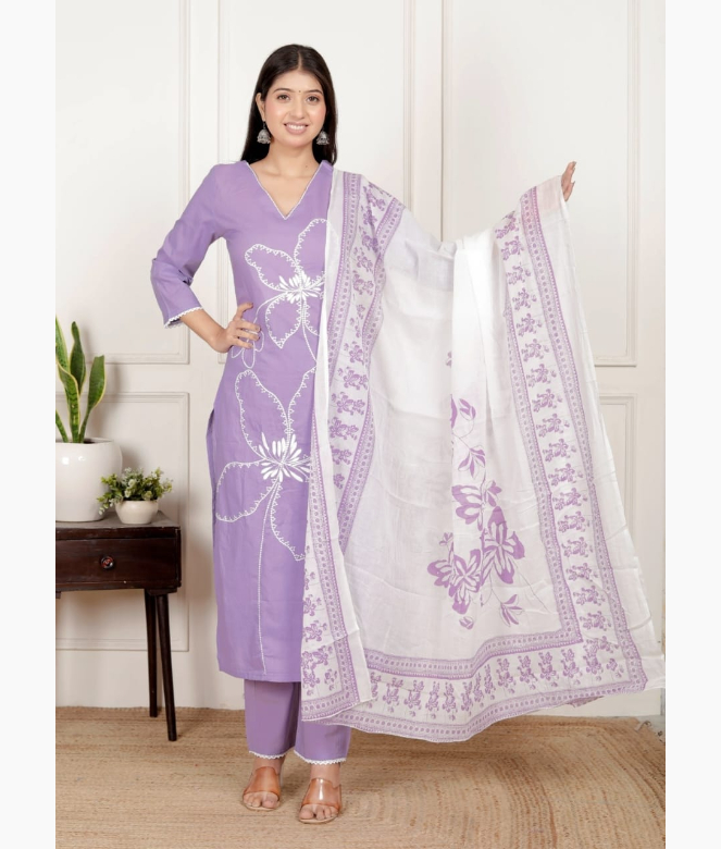 Experience timeless elegance with this amazing stitched embroidery cotton printed purple suit set, perfect for casual and festive occasions alike. Crafted from premium-quality breathable cotton, this suit set offers unmatched comfort while showcasing exquisite craftsmanship. The kurta features intricate embroidery detailing on the neckline and sleeves, beautifully complementing the vibrant yet subtle printed patterns spread across the fabric.