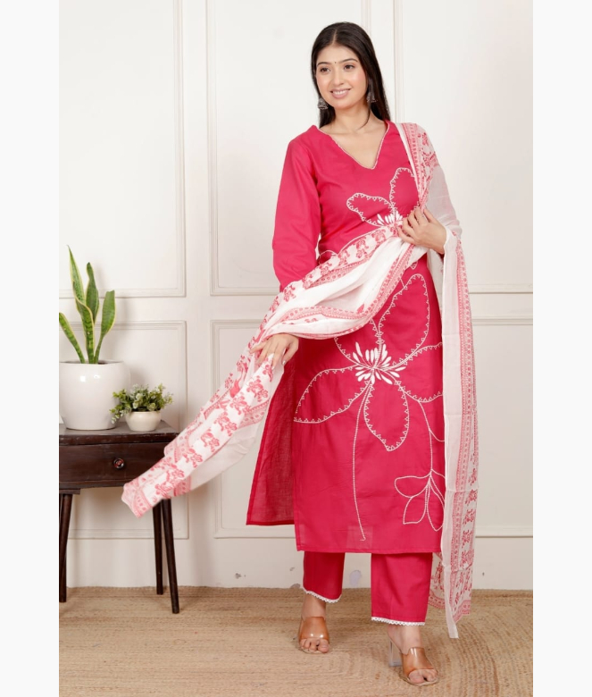 Experience timeless elegance with this amazing stitched embroidery cotton printed red suit set, perfect for casual and festive occasions alike. Crafted from premium-quality breathable cotton, this suit set offers unmatched comfort while showcasing exquisite craftsmanship. The kurta features intricate embroidery detailing on the neckline and sleeves, beautifully complementing the vibrant yet subtle printed patterns spread across the fabric.