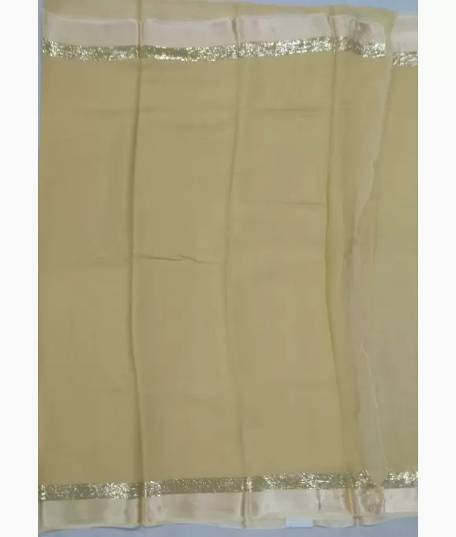 Girlish pattern of rich look design. All over plain saree with golden colour zari and satin patta on both side border pallu of the saree is plain with same border design of saree.