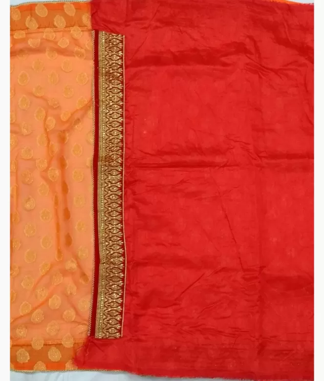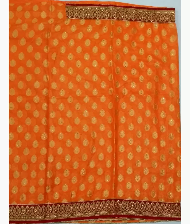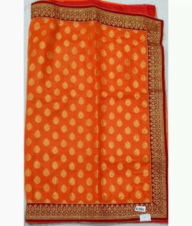 Border is of contrast colour with velvet fabric is on jari and sequence work on saree border. Matching work of saree border is on blouse patti with contrast red colour for neck and sleeves.