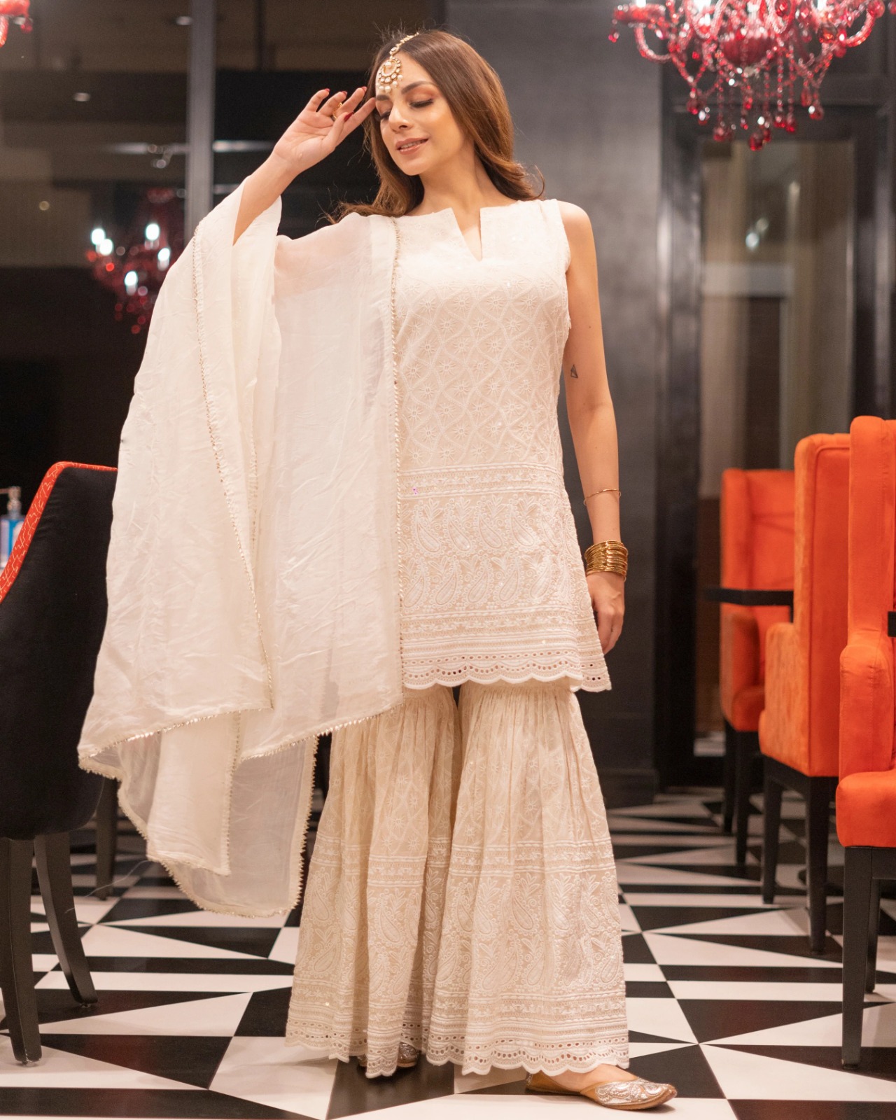 A beautiful cotton sharara suit set combines the comfort of cotton fabric with the elegance of a traditional sharara silhouette.