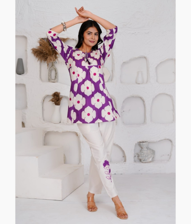 Add a touch of earthy elegance to your wardrobe with this stylish patchwork cotton purple co-ord set, perfect for the modern woman who loves comfort with character. Crafted from soft, breathable cotton, this set features a beautifully stitched silhouette that drapes effortlessly, making it ideal for day-to-night wear. The top showcases intricate patchwork detailing in complementary tones, adding depth and a handcrafted charm to the overall design.