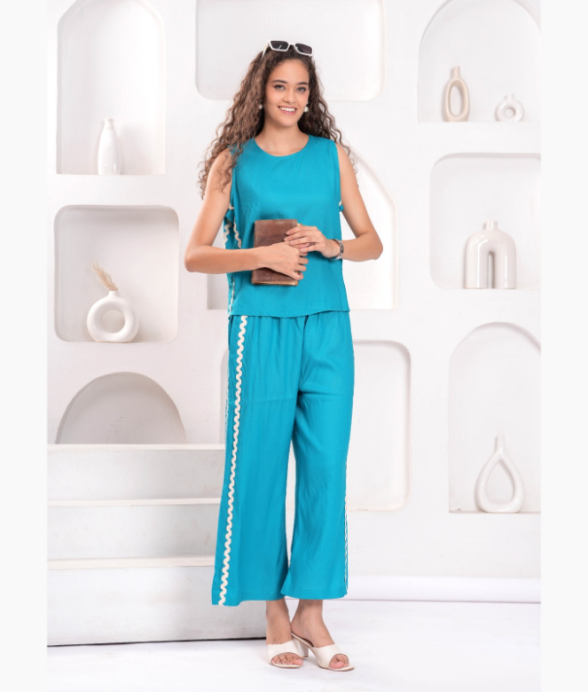 Stay effortlessly stylish this summer with this stunning stitched rayon blue co-ord set, perfect for warm, sun-kissed days. Crafted from lightweight and breathable rayon fabric, this co-ord set offers both comfort and sophistication. The deep blue hue adds a rich, elegant touch that transitions seamlessly from casual brunches to evening gatherings.