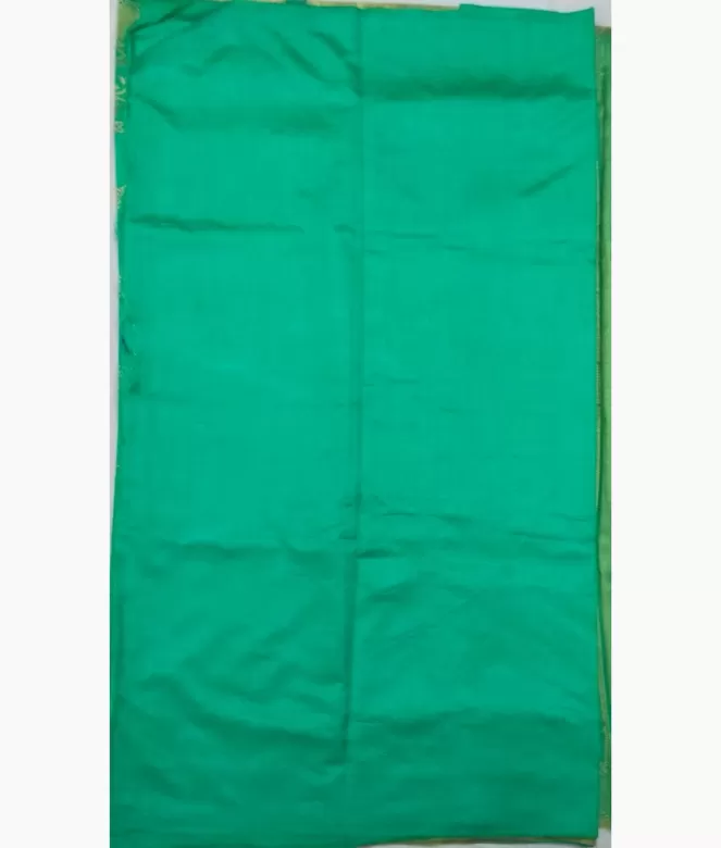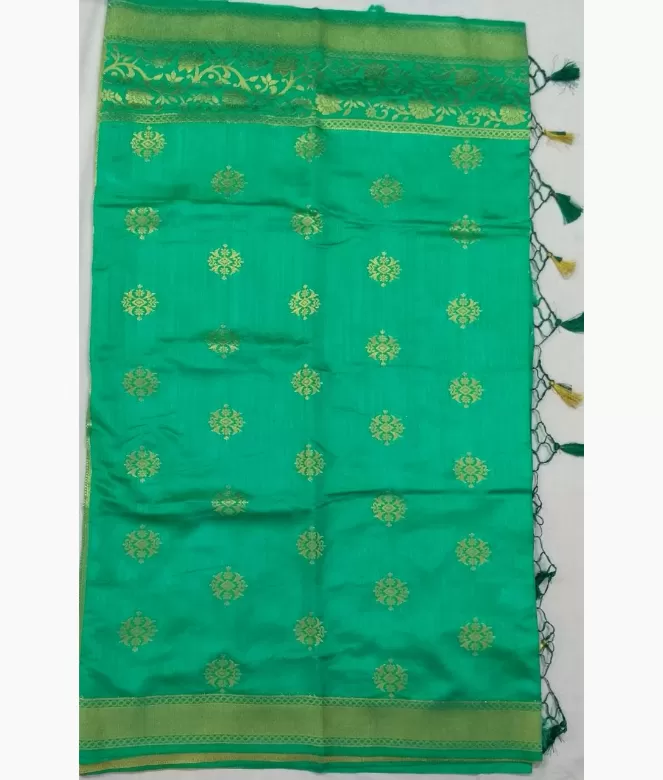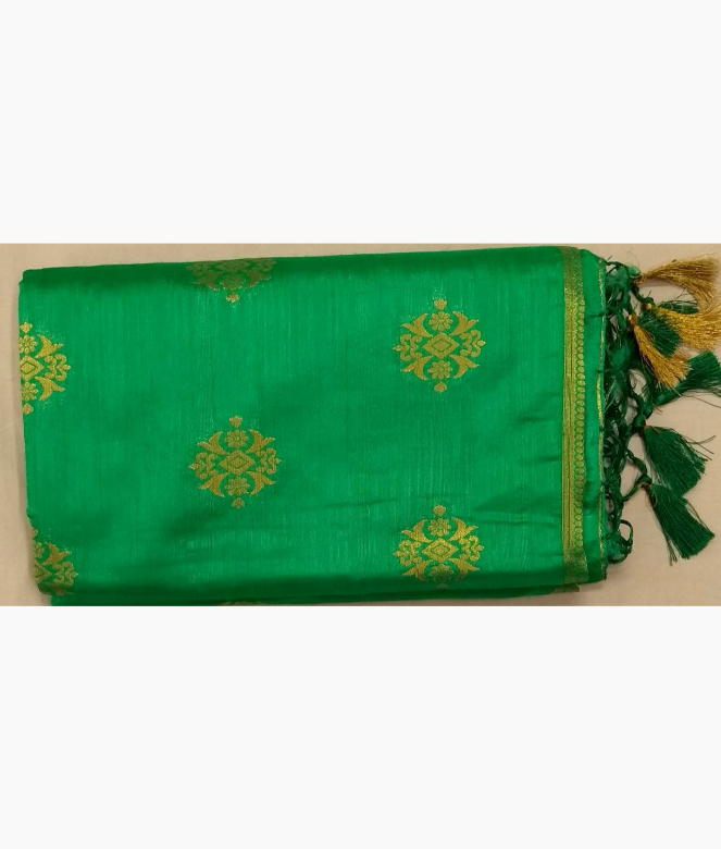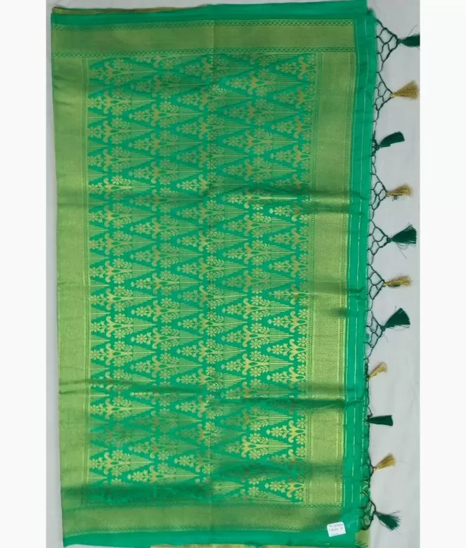 Border is of golden colour leaf flower design of zari work with golden colour zari Patti on saree. Matching same border of saree is on blouse for neck and sleeves.