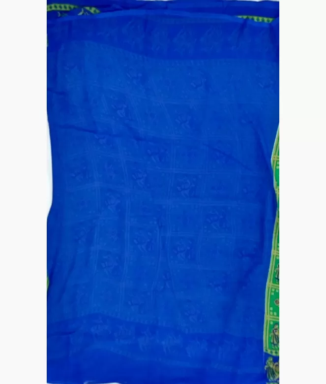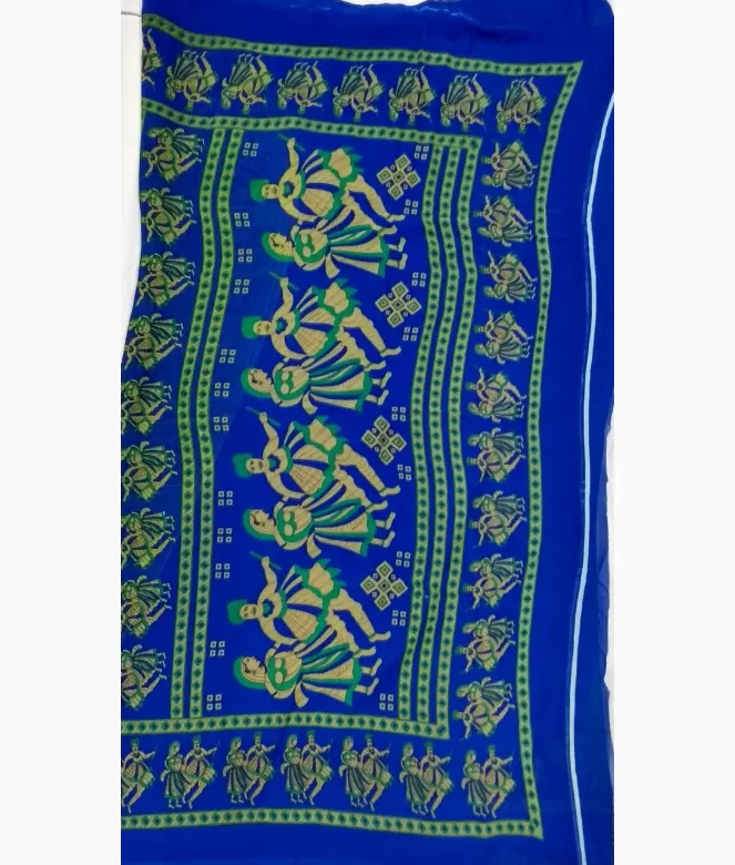Border is of dancing animated image with contrast patti on saree. Matching same fabric plain blouse is on saree in contrast colour.