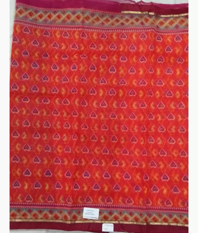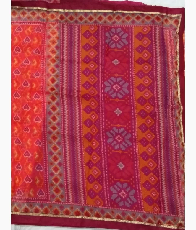 Border is of dupion silk fabric with zari piping in contrast colour of saree. Blouse is of plain row silk fabric with matching same dupion silk fabric plain patti.