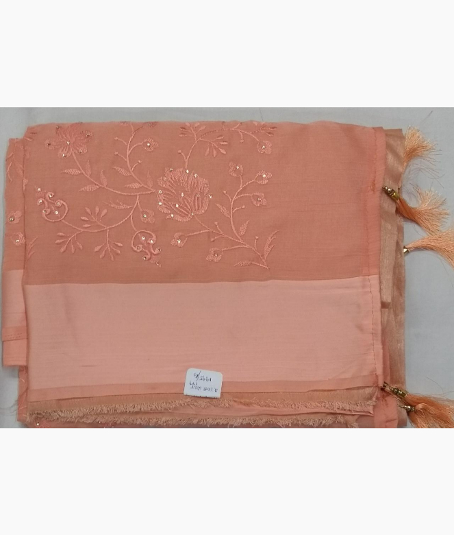 Heavy pallu thread and sequence work with latkan. Fine matching colour satin patta design on border. Blouse is of row silk fabric with same border of saree.