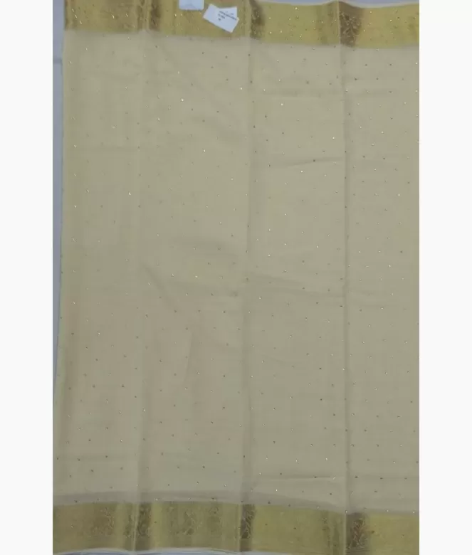 All over golden colour sequence dot work on saree. Golden colour strips zari patti with sequence work on pallu.