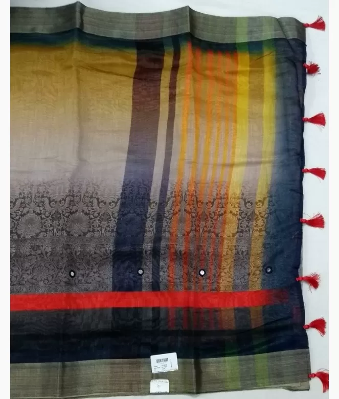All over multicolour printed with mirror work on saree. Girlish pattern in designer saree. Panel is of multicolour printed with mirror round work on all over saree.