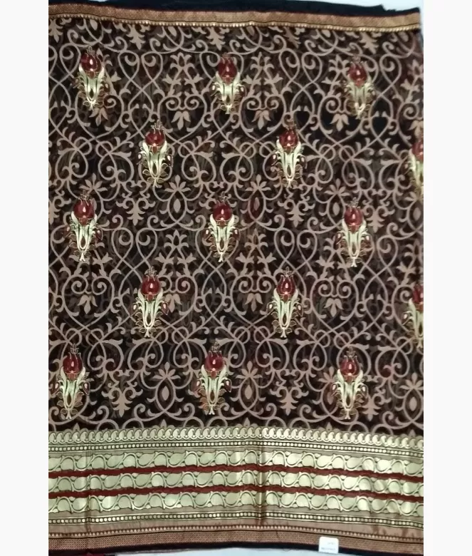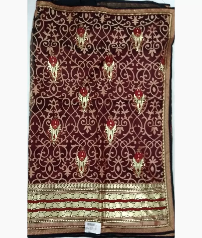 Heavy golden colour leaf jaal on panel surrounding golden and black piping on all over saree. Border is of golden colour zari work. Contrast colour khadi silk fabric is on blouse with matching same border of saree.