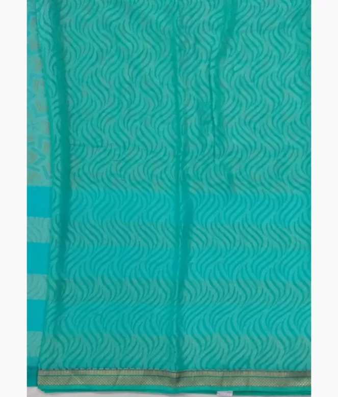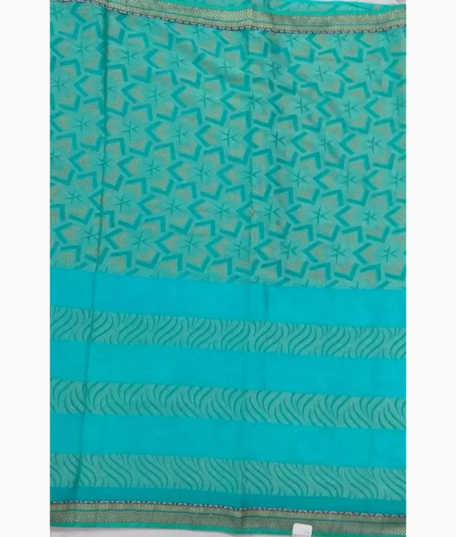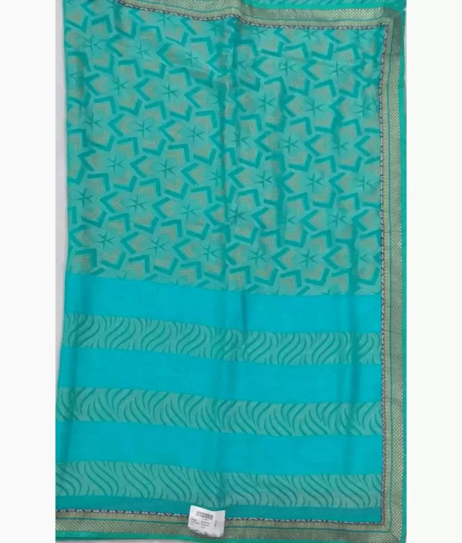 Border is of multi colour piping with golden colour zari jaal on all over saree. Matching work of saree print and border is on blouse for neck and sleeves.