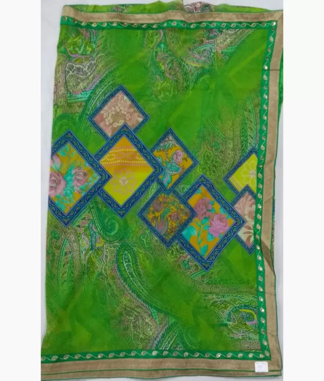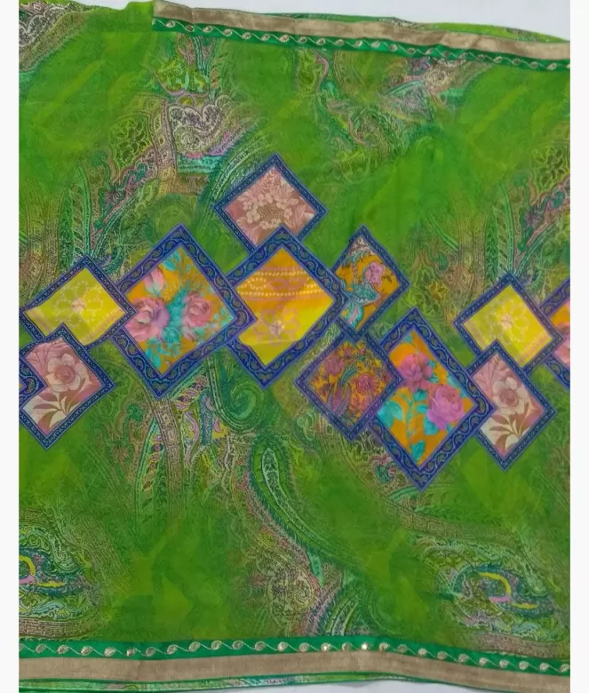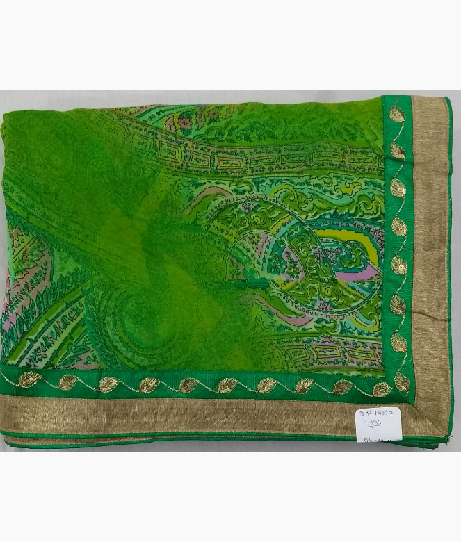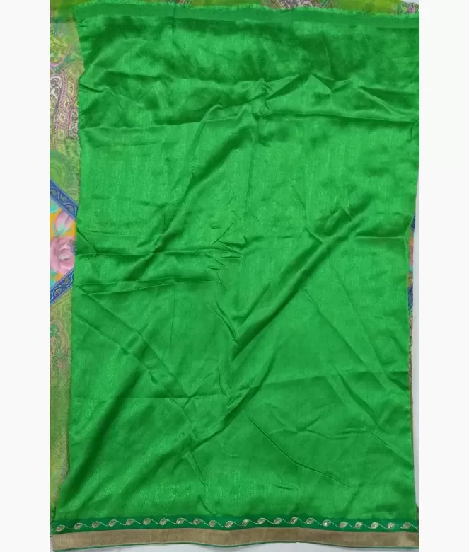 Border is of fine zari work in golden colour leaf design with green colour thread and zari patti with green colour piping surrounding all over on saree. Blouse is of dupion silk fabric with matching same border of saree.