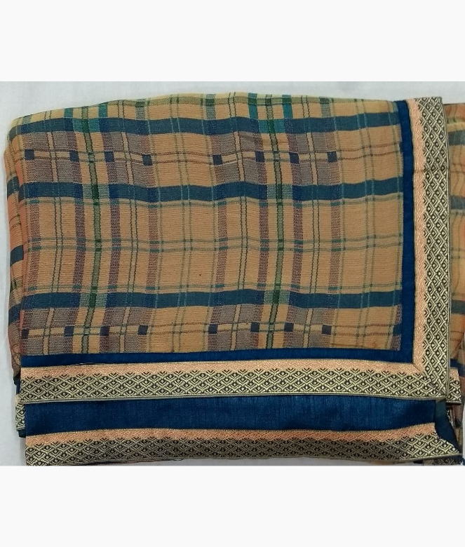 All over multi colour broad cheek strip design printed on same border is of golden colour heavy zari jaal patti with blue colour patti all over on saree.