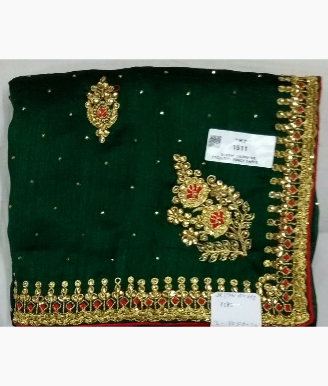 Border is of golden colour leaf design jaal boota of zari thread and sequence work with surrounding piping on all over saree. Matching work of saree border is on blouse for neck with piping on sleeves.