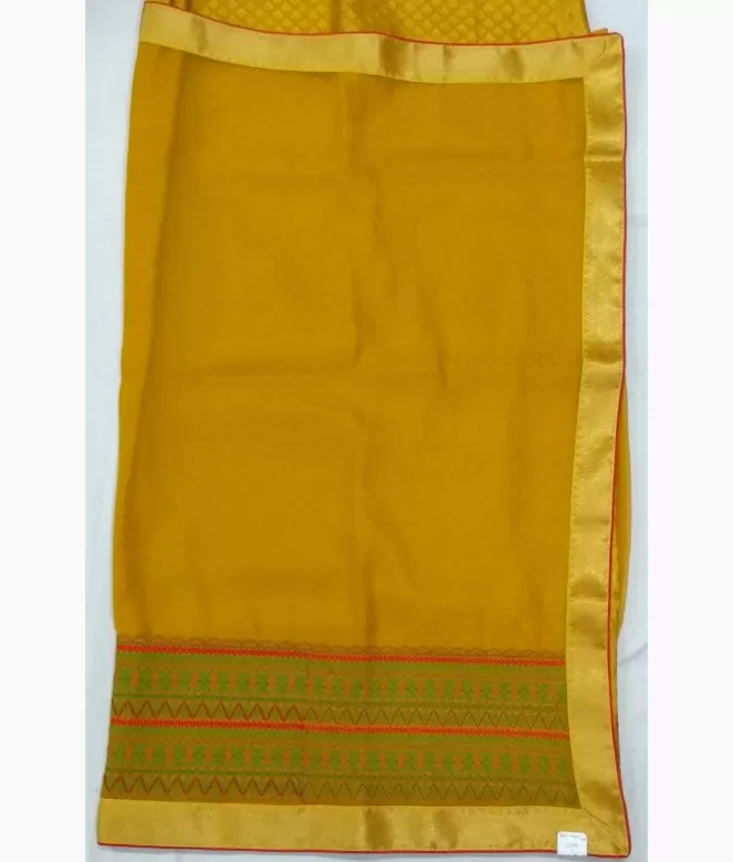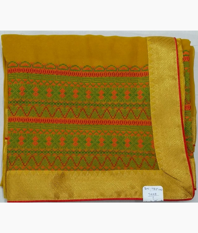 All over girlish pattern border pallu saree. Heavy multi colour thread work on panel with fine quality golden colour zari on border with surrounding piping in red colour on all over saree.