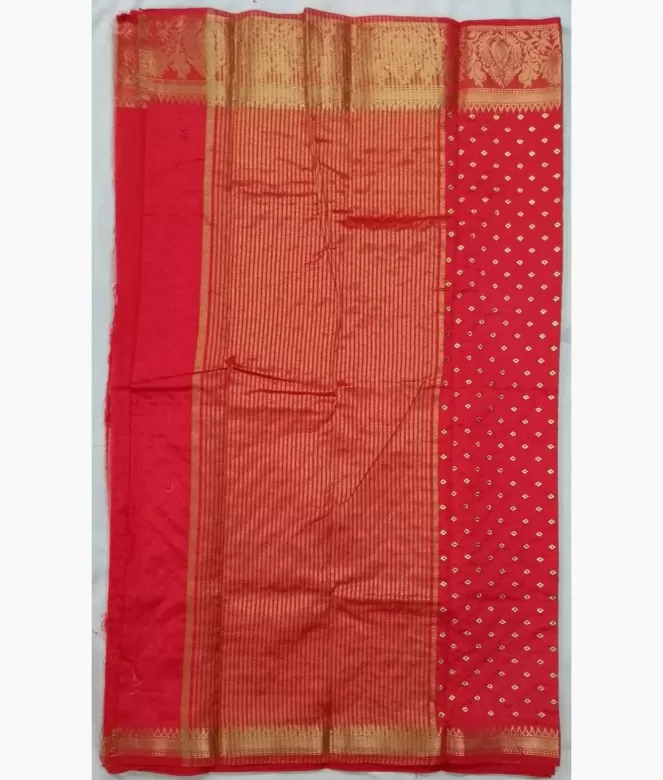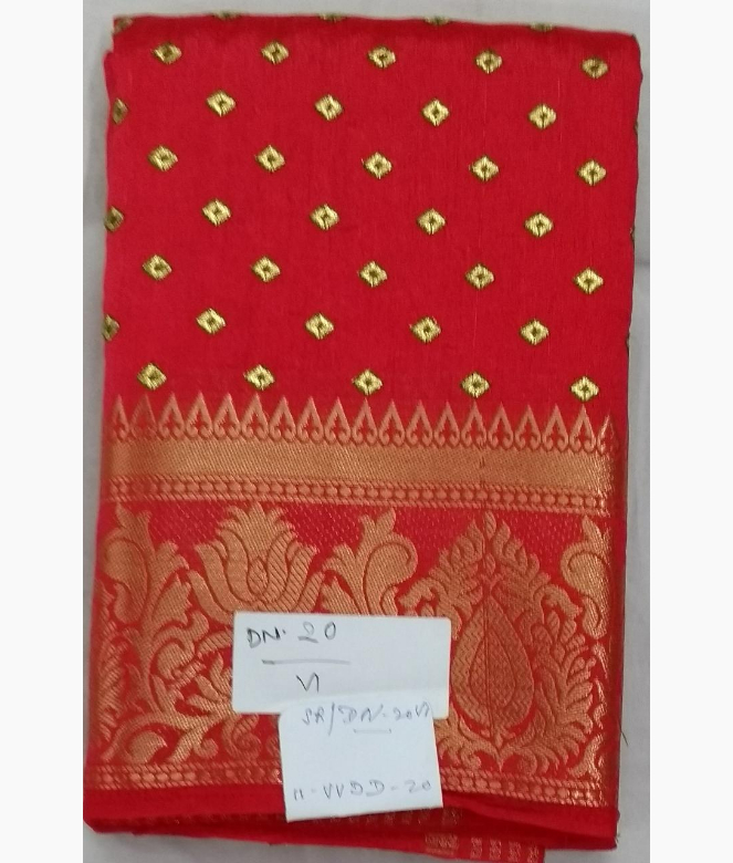 All over small rhombus booty of Golden colour zari temple in thread work on all over saree. Border is of golden zari design on saree.