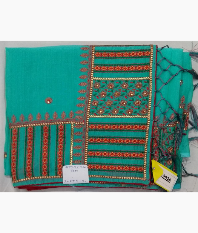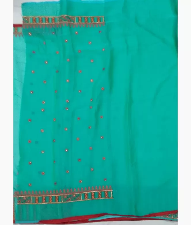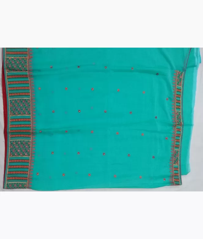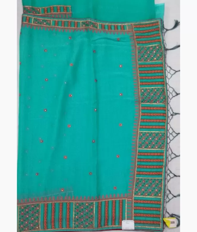Multi colour thread strips and flower design with sequence work on border. Heavy border with fine quality of thread and sequence work on saree. Matching work of saree border is on blouse for neck and sleeves.
