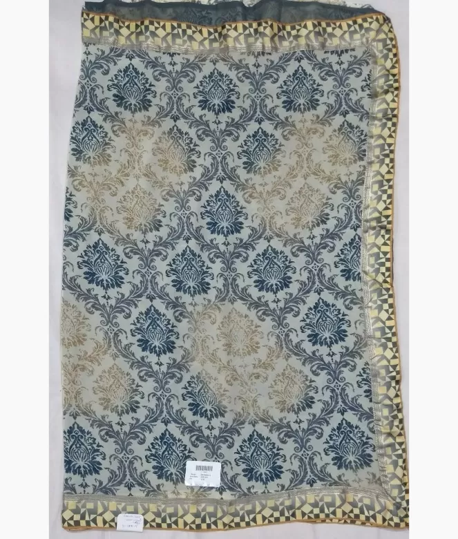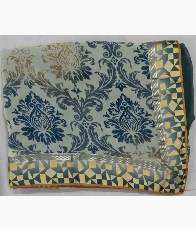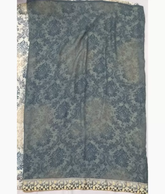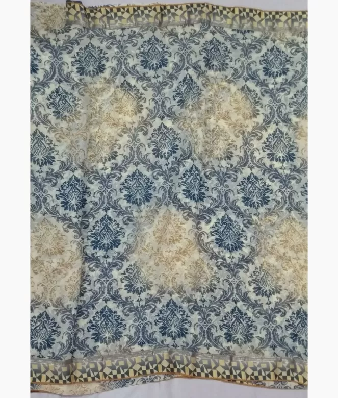 All over Banarasi flower style printed saree with light dark shades on saree. All over geometrical prints. Border is of satin fabric with golden colour zari strip patti on saree.
