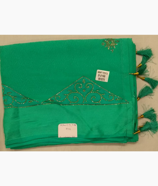 Heavy self colour thread with sequence work on panel. Border is of satin patta. Blouse is of same matching same colour border of saree.