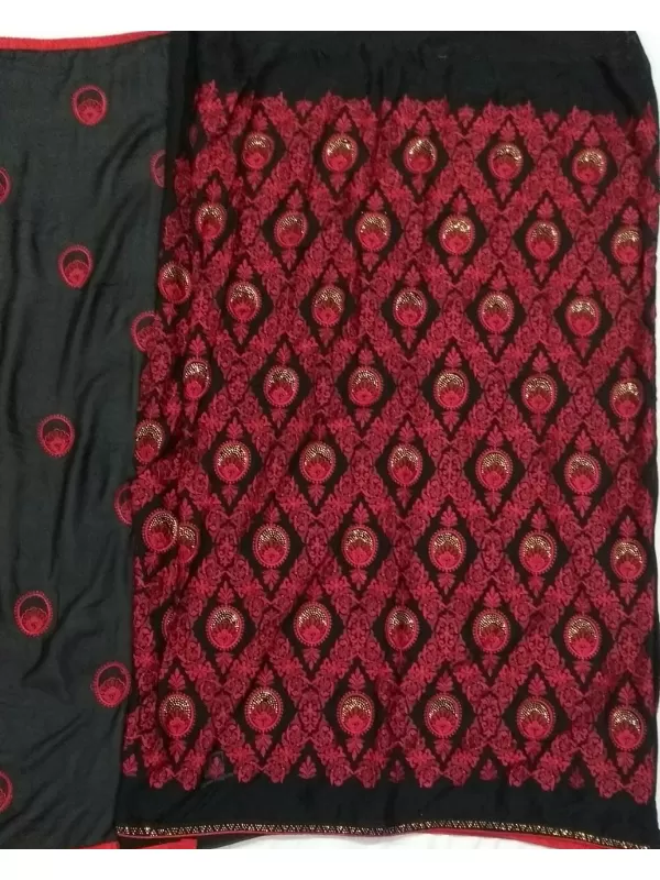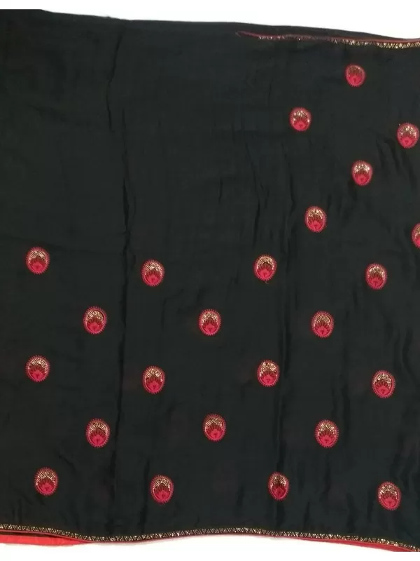 Border is of red colour piping with sequence work on saree. Blouse is of matching saree work with heavy jaal for neck, sleeves and back.