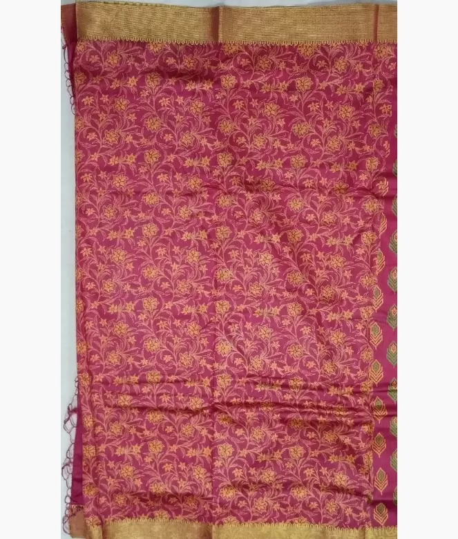 Border is of golden colour designed zari patti. Blouse is of all over flower leaf print jaal with matching same border of saree for neck and sleeves.