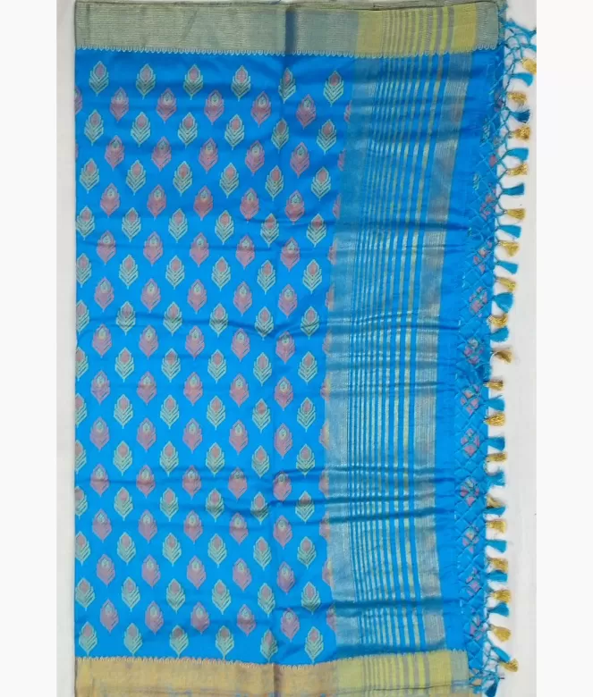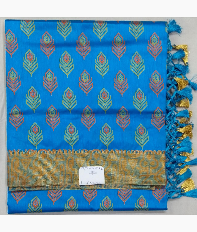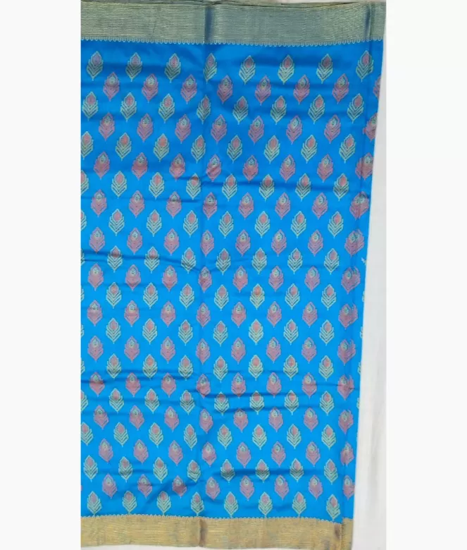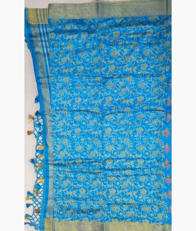 Border is of golden colour designed zari patti. Blouse is of all over flower leaf print jaal with matching same border of saree for neck and sleeves.