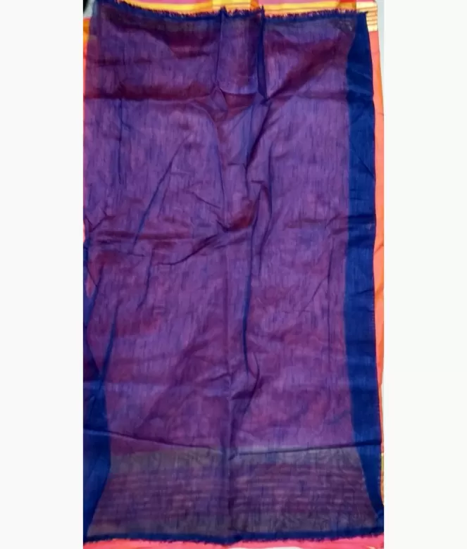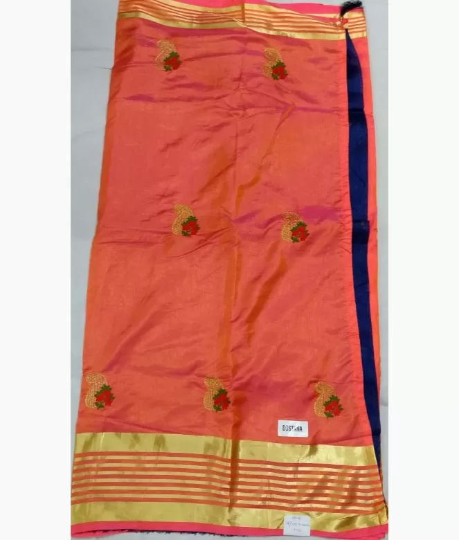 Border is of golden colour strips of broad and slim strips on border. Blouse is of plain row silk fabric in blue colour.