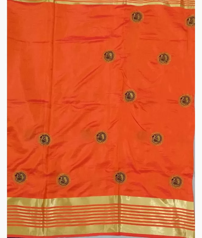 Golden zari and red colour flower ambi design boota on all over saree with latkan on corner.