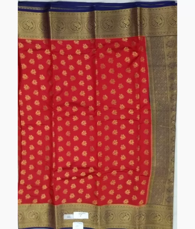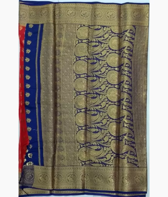 Border is of golden colour zari jaal big round design inside peacock booty in contrast blue colour of matching pallu. Blouse is of blue contrast colour of matching same work of saree.