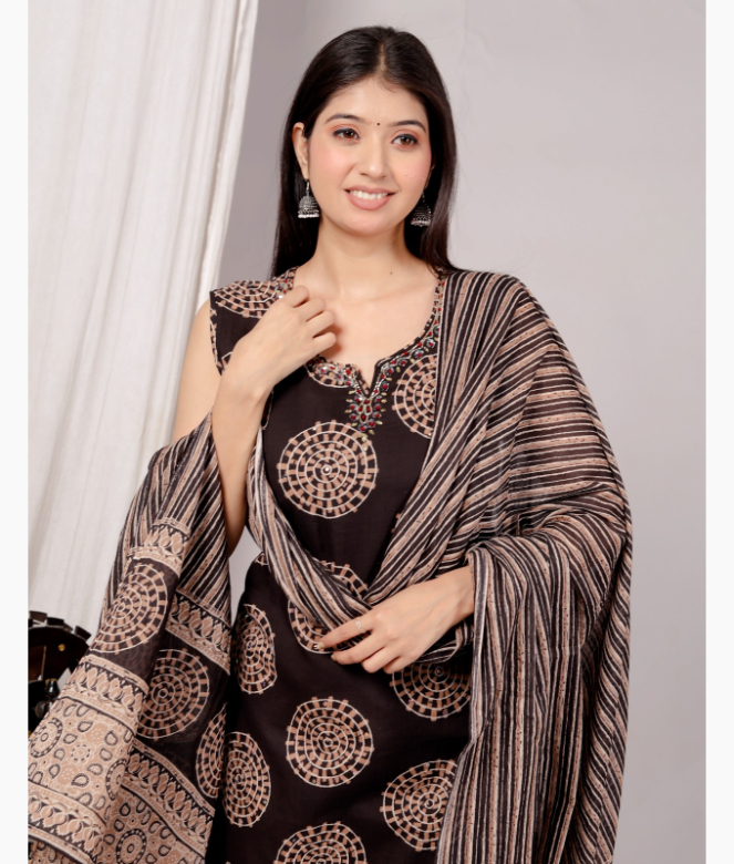 Introducing our beautiful stitched cotton black suit collection – a perfect blend of comfort, style, and elegance. Made from high-quality, breathable cotton fabric, these suits are designed to keep you cool and comfortable throughout the day while ensuring you look effortlessly graceful. Each suit features carefully crafted stitching and thoughtful design details that enhance its overall appeal.