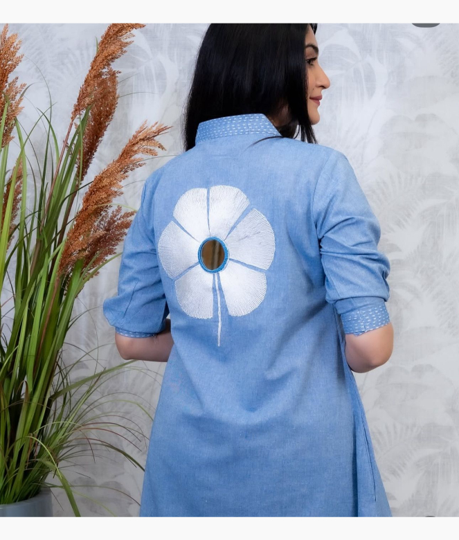 Add a touch of sophistication to your wardrobe with this elegant stitched embroidery cotton blue katha kurti with pant collection. Crafted from soft, breathable cotton, this set is perfect for everyday elegance and comfort. The kurti features traditional Katha-style embroidery that beautifully highlights the rich blue hue, blending ethnic charm with contemporary style. Its straight-cut design ensures a flattering fit for all body types, making it ideal for office wear, casual outings.
