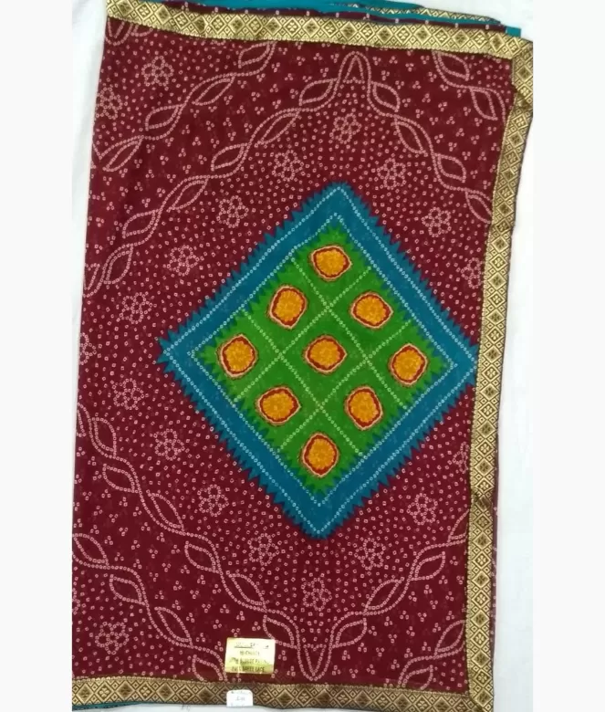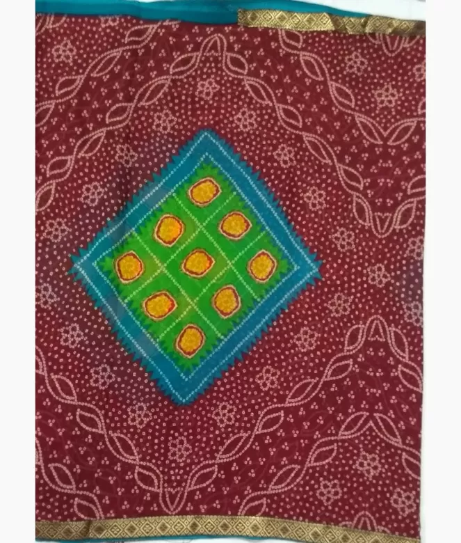 All over Jaipuri bhandhej print saree with big rhombus design in multi colour on saree. Border is of golden colour zari with rhombus design weaving on saree.