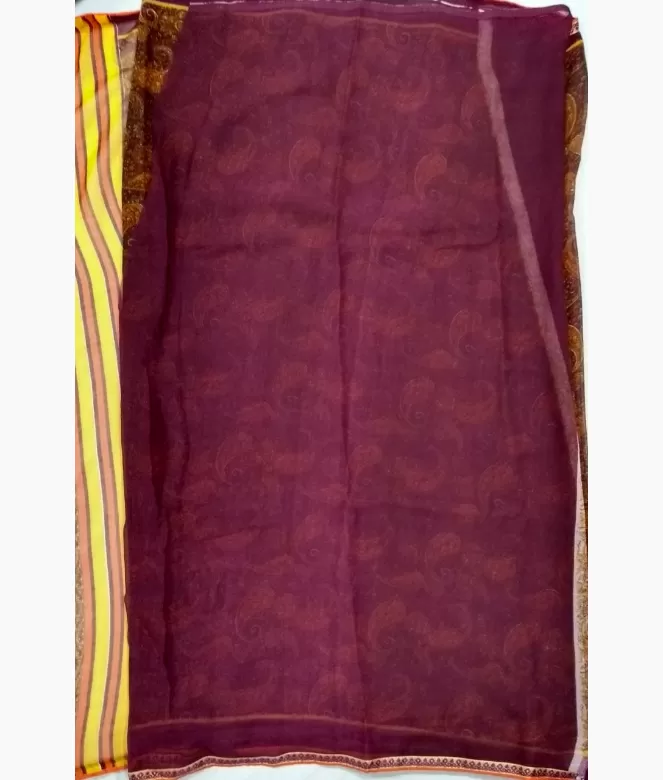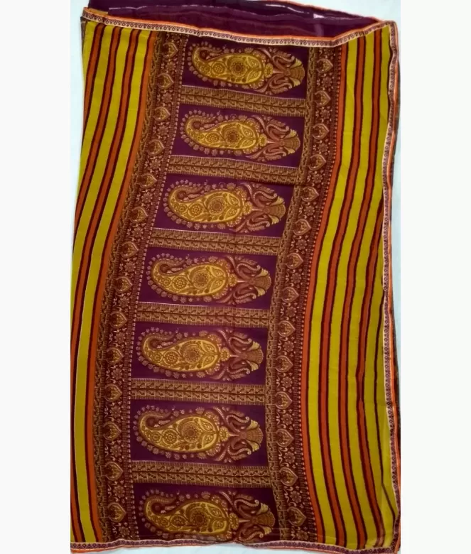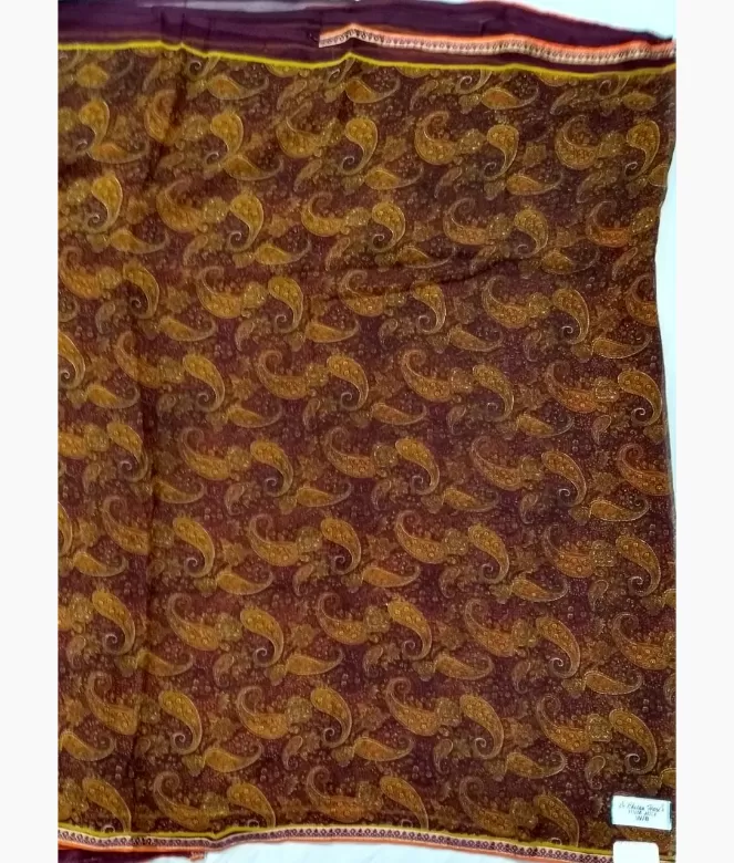All over matching colour ambi flower print design on saree. Big ambi and strips design on pallu.
