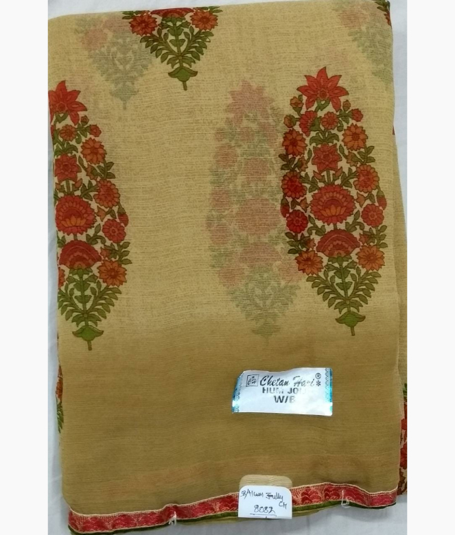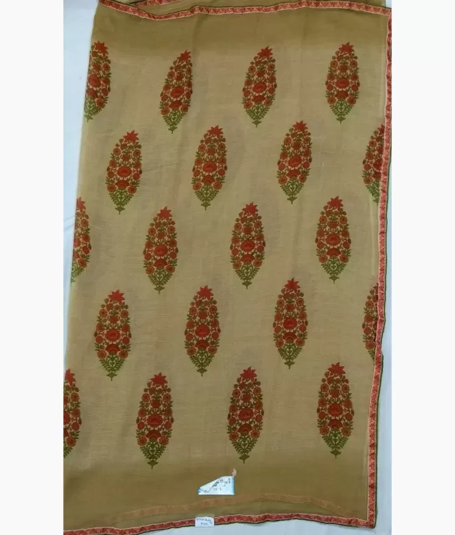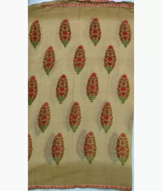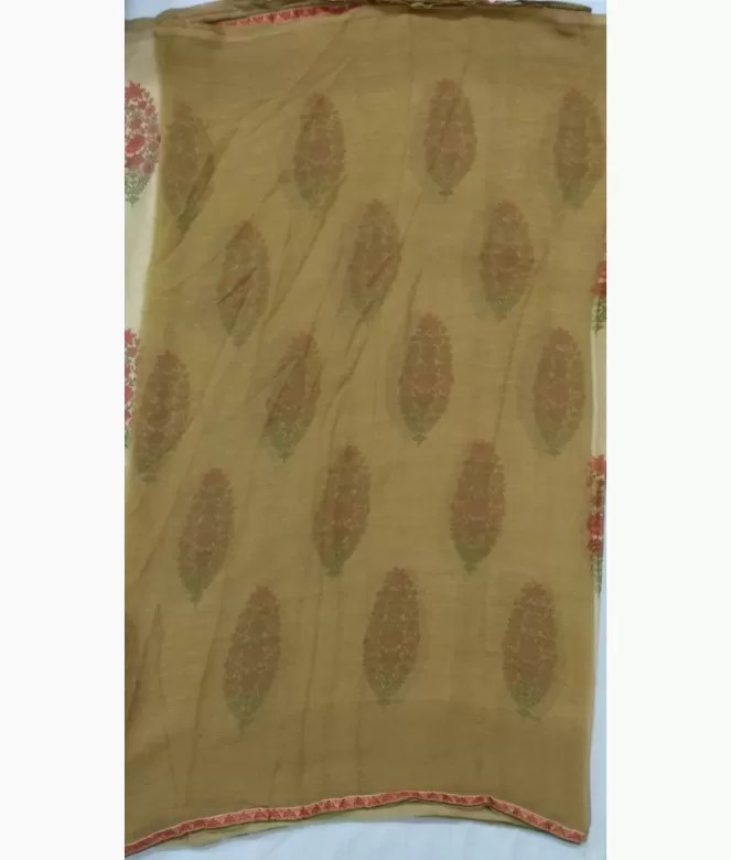 All over multi colour flower and leaf ambi design printed on saree with golden red zari border on saree.