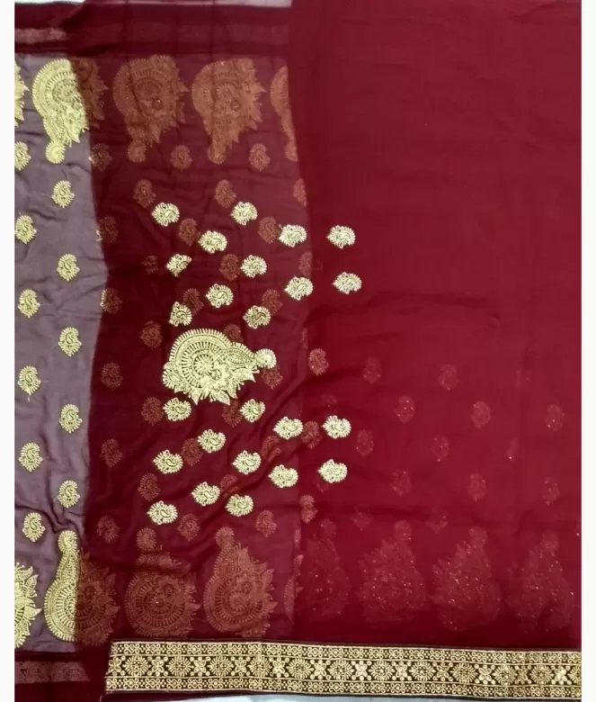 All over thread boota of golden colour on saree. Big boota's in golden colour thread on the corners of saree.