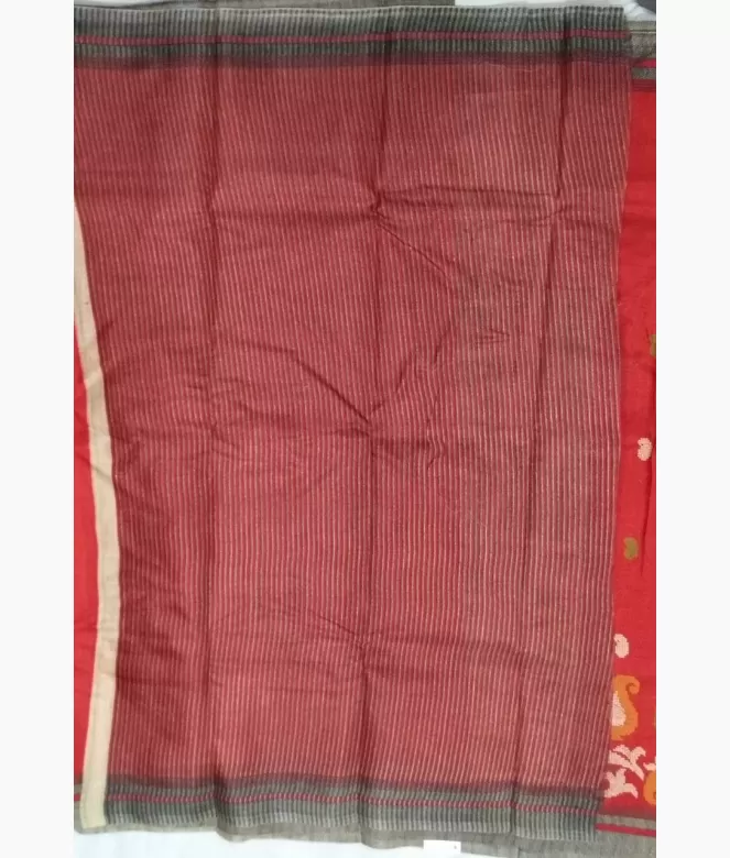 Border is of big ambi in multi colour thread jhardi in lehariya design in thread work on saree panel. Blouse is of contrast colour strips weaving design for all over.