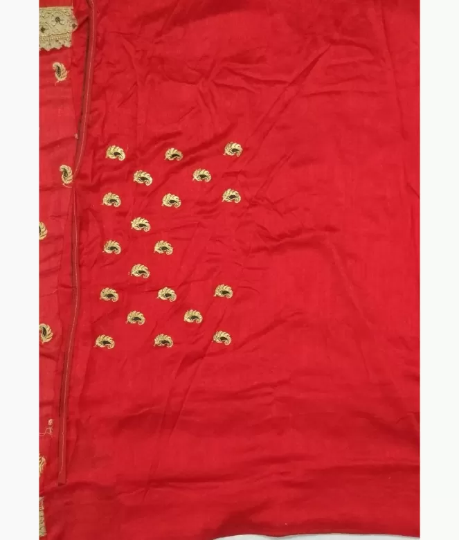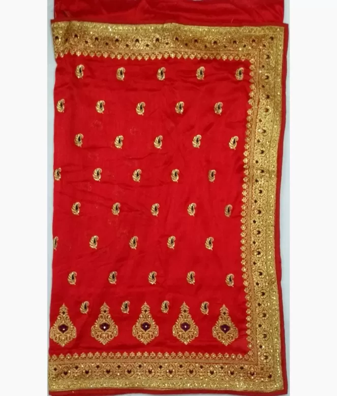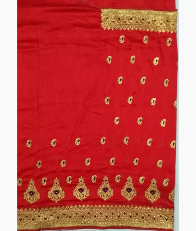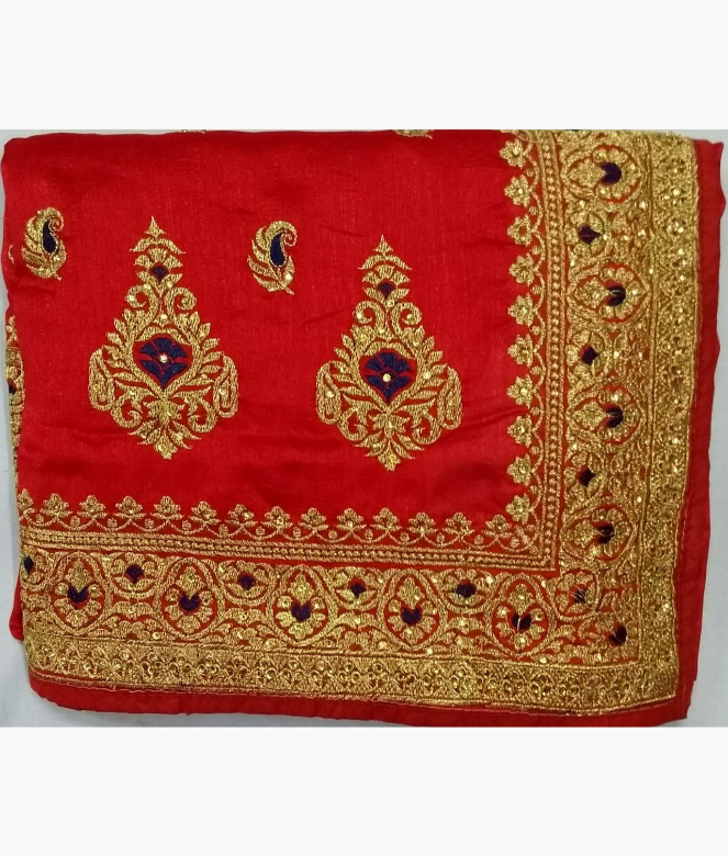 Big ambi in golden colour zari with blue colour on panel of saree. Sequence work on boota all over saree. Border is of flower design with golden colour zari, thread and sequence work on saree. Matching work of saree is on blouse for neck only.