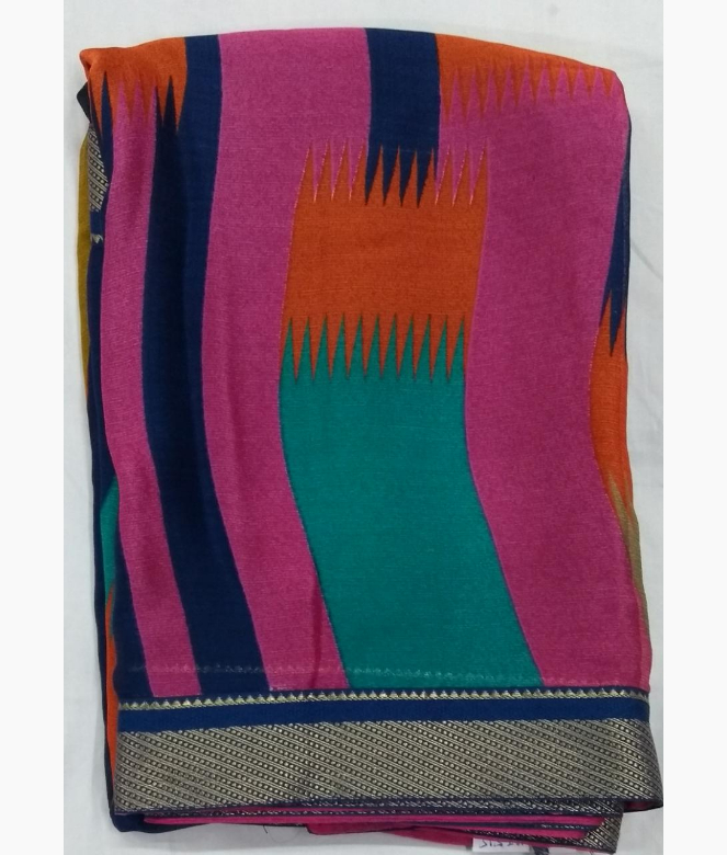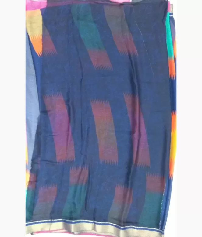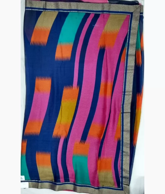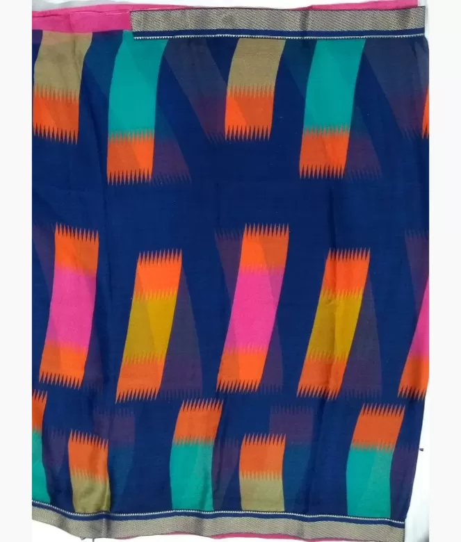 All over multi colour printing design on saree. Border is of antique zari work with blue colour piping Patti on saree.