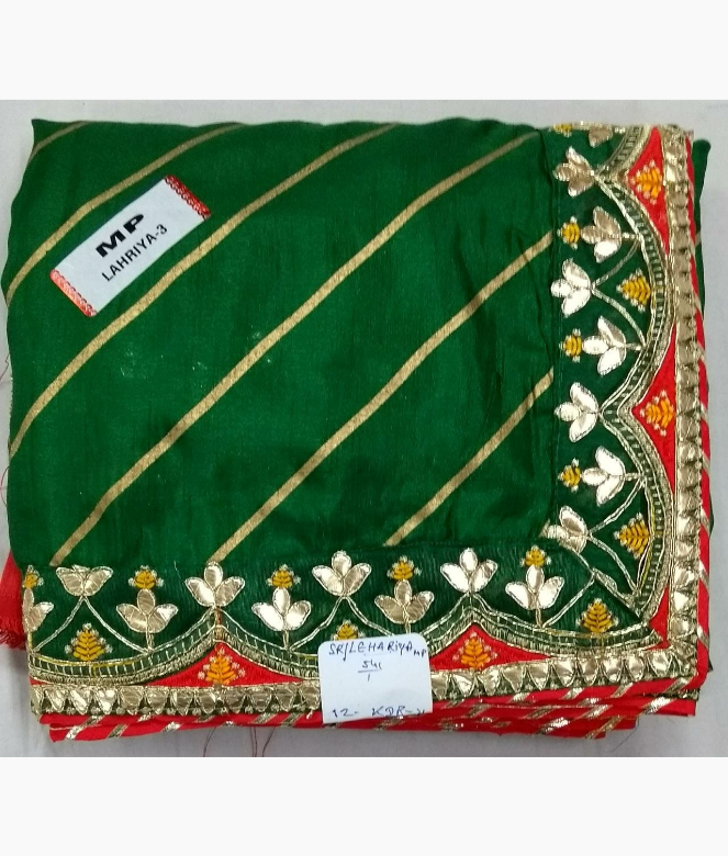 Golden colour gota flower design with yellow colour thread work on border patti with red and golden colour piping surrounding on all over saree. Contrast colour of blouse with matching same border of saree.