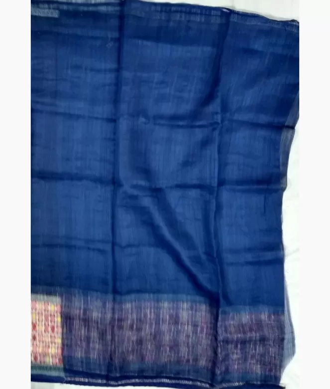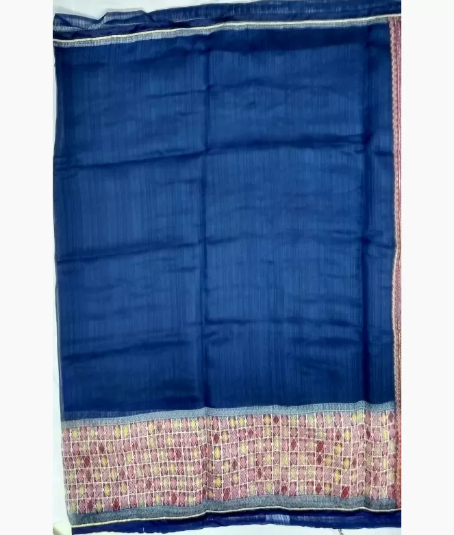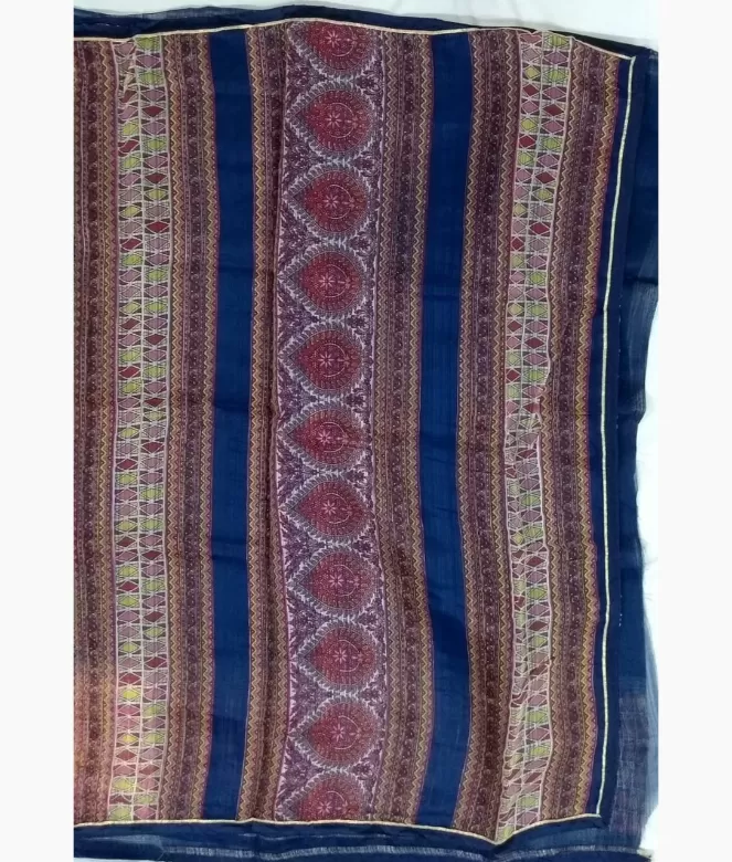 Surrounding same colour piping with golden colour zari on all over saree. Border is of multi colour rhombus in square design printing with piping. Matching same colour and fabric is of plain blouse.