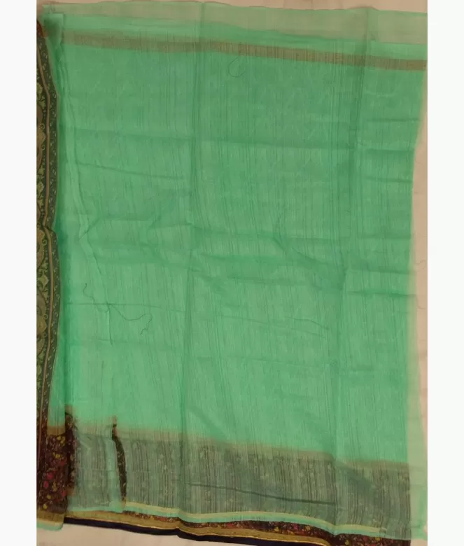 border is of multi colour flower and leaf design printing with piping. Matching same colour and fabric is on plain blouse.
