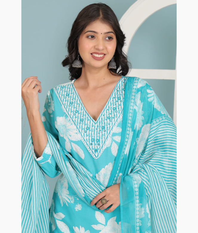Elevate your ethnic wardrobe with this beautiful stitched embroidery cotton blue suit set, a perfect blend of comfort, elegance, and traditional charm. Crafted from soft, breathable cotton, this suit set ensures all-day comfort while keeping you stylish. The kurta features exquisite embroidery work on the neckline, sleeves, and hem, adding a touch of sophistication and handcrafted beauty to the ensemble.