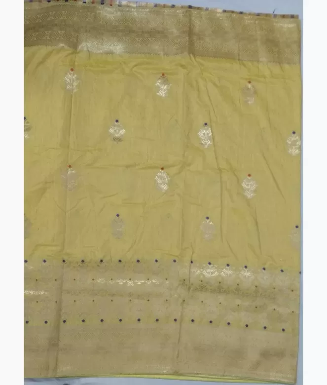 All over golden colour zari and thread boota on saree. Heavy Banarasi pallu with multi colour thread booty jaal with latkan.