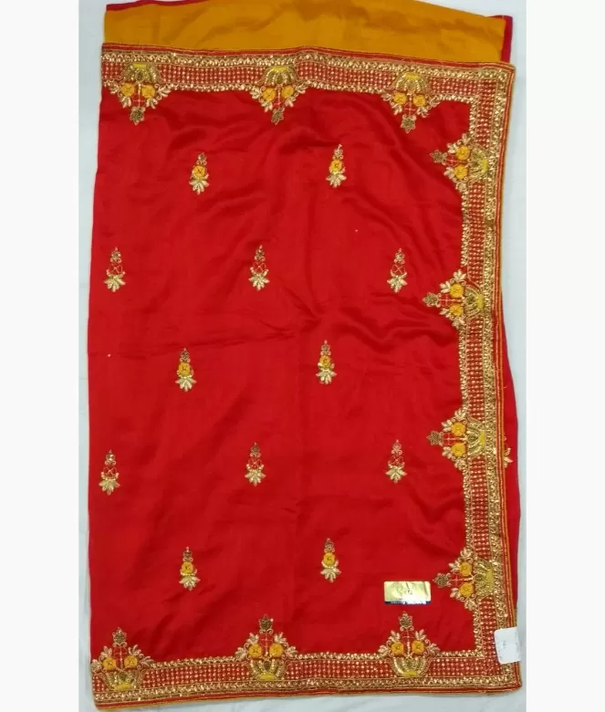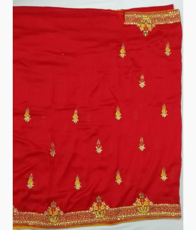 Border is of fine antique and sequence design with high quality of work on saree. Matching work of saree is on blouse for sleeves only with contrast colour.
