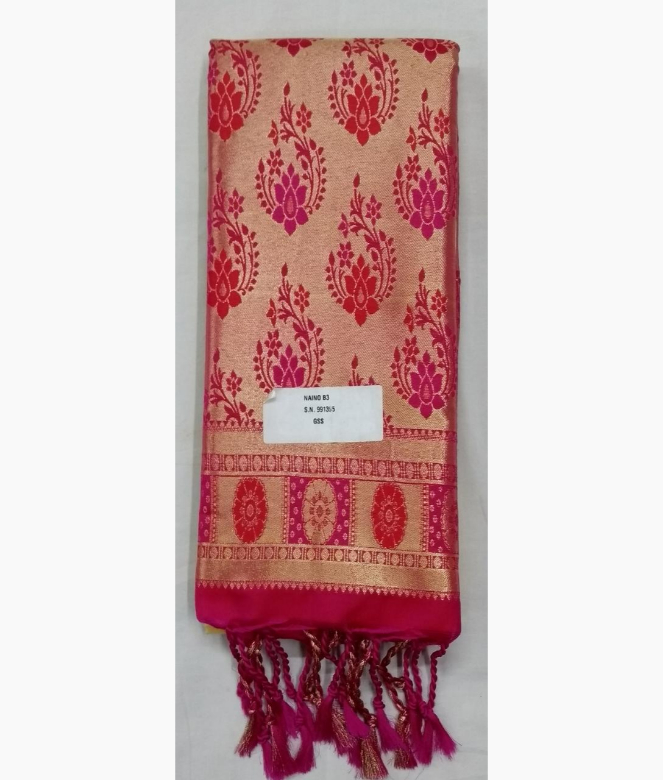 All over leaf and flower embos weaving design of thread boota with golden colour zari on all over saree. Heavy pallu in red contrast colour with latkan of Flower and leaf design with thread and zari work.
