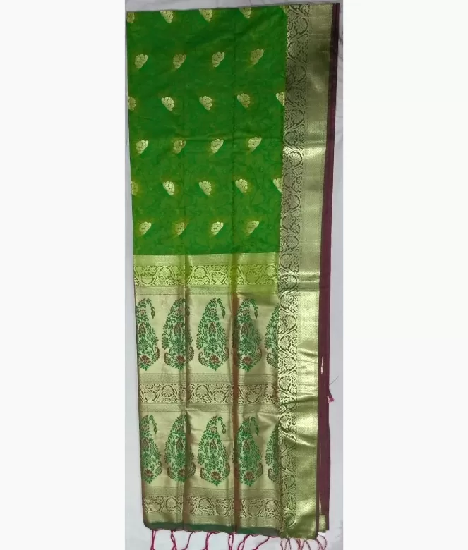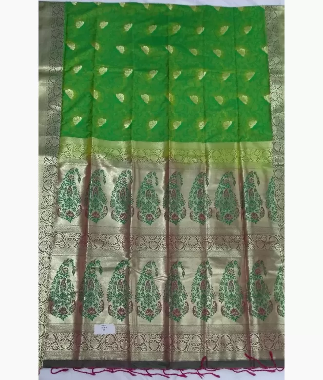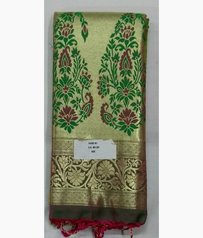 Small emboss golden colour flower design is on all over saree makes the saree graceful. All over saree with pallu has a very good design of flower in same emboss pattern. Matching work saree border is on blouse patti for back, neck and sleeves.