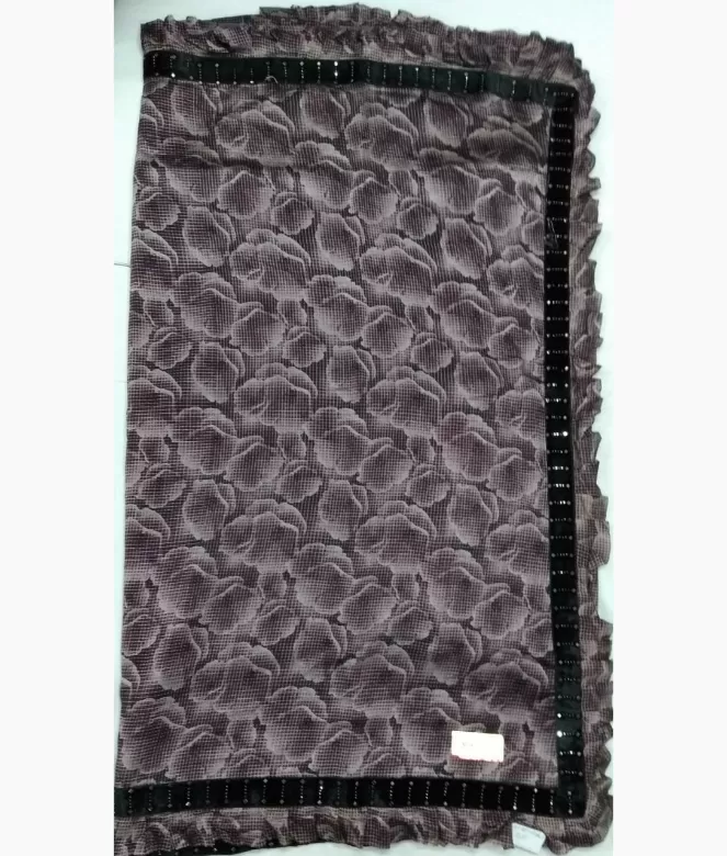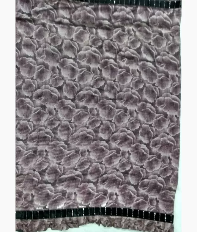 All over digital print flower design with excellent on saree. Border is of black colour velvet patti with mirror work and frill on saree.