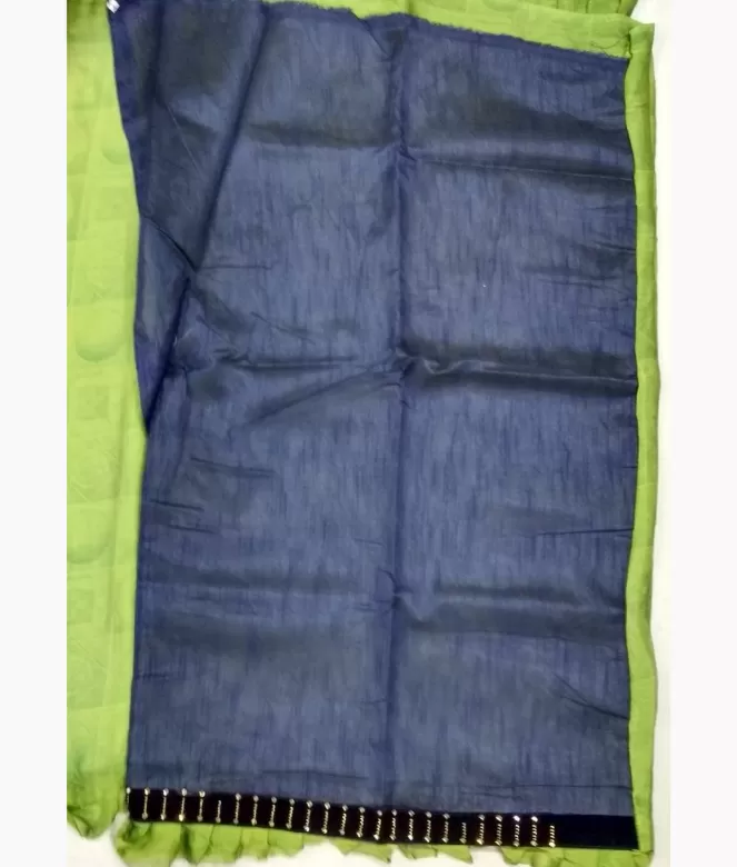 Contrast colour black velvet patti on border with mirror work and sequence work on border patti with frill surrounding all over on saree. Blouse is of dupion silk fabric with matching same border of saree along contrast colour on blouse.